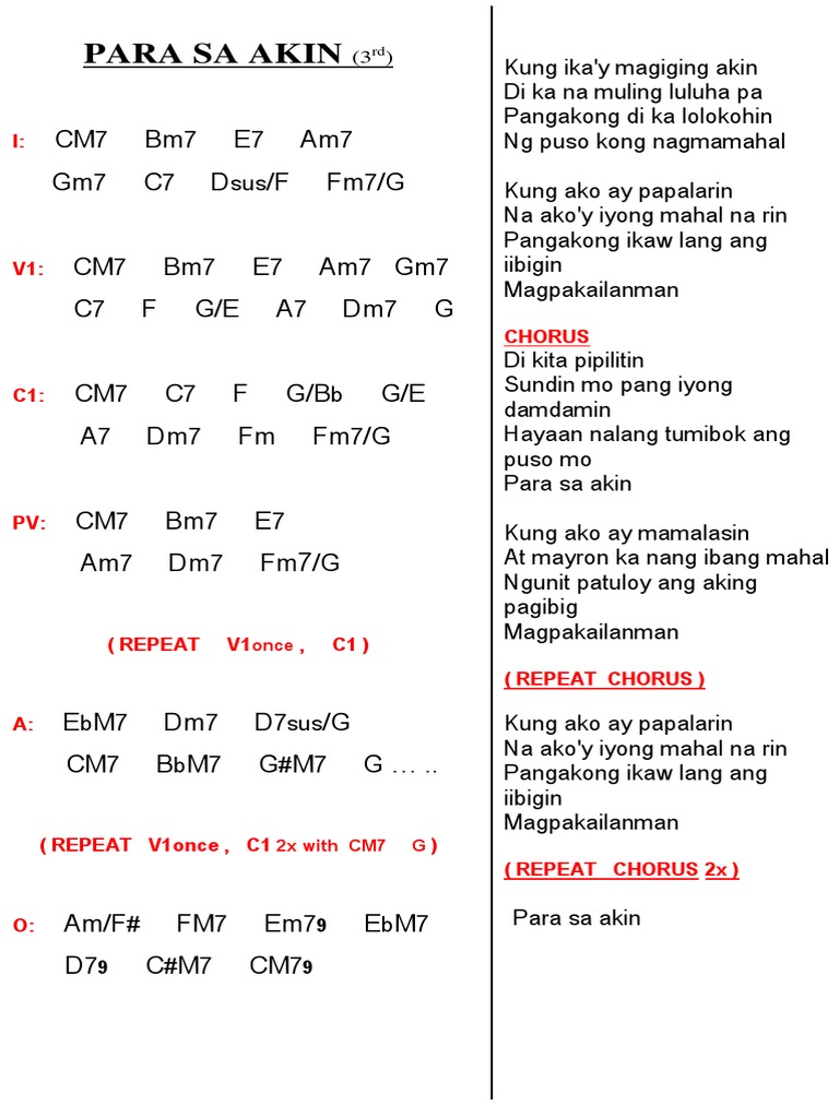 12312008 Para Sa Akin EbM7 Dm7-G7 Kung ika y magiging akin Cm7 Bbm7 Eb9 Di ka na muling luluha pa Ab9 Gm Cm7 Pangakong di ka lolokohin Fm Bb Ng puso kong nagmamahal Verse 2 EbM7 Dm7-G7 Kung ako ay papalarin Cm7 Bbm7 Eb9 Na ako y iyong mahal na rin Ab9 Gm Cm7 Pangakong ikaw lang ang iibigin Fm Bb Magpakailanman Chorus Eb Ebm9 Di kita pipilitin Ab Abm. 4282019 Lyrics for Para Sa Akin by Faithmusic Manila. Kung ikay magiging akin Di ka na muling luluha pa Pangakong di ka lolokohin Ng puso kong nagmamahal Kung ako ay papalarin Na akoy iyong mahal na rin.