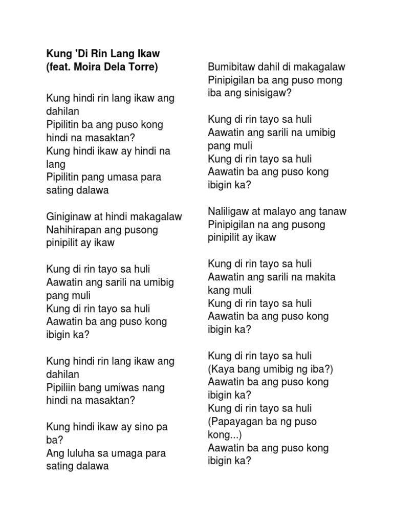 Kung ako ay papalarin Na akoy iyong mahal na rin Pangakong ikaw lang ang iibigin Magpakailanman. Kung ikay magiging akin Di ka na muling luluha pa Pangakong di ka lolokohin Ng puso kong nagmamahal Kung ako ay papalarin Na akoy iyong mahal na rin Pangakong ikaw lang ang iibigin Magpakailanman Chorus Di kita pipilitin Sundin mo pang iyong damdamin Hayaan nalang tumibok ang puso mo Para sa akin Kung. Kung ikay magiging akin Di ka na muling luluha pa Pangakong di ka lolokohin Ng puso kong.
