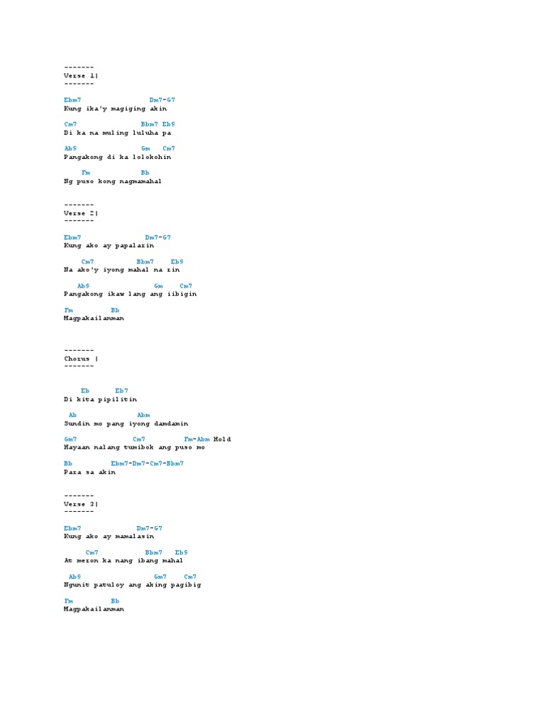 D-Cm7-F7-Bm-D7-G-A7 break Verse D Cm7-F7 Kung ikay magiging akin Bm D7 Di ka na muling luluha pa G Fm B7 Pangakong di ka lolokohin Em Em7 A7 Ng puso kong nagmamahal D Cm7-F7 Kung ako ay papalarin Bm D7 Na akoy iyong mahal na rin G Fm-B7 Pangakong ikaw lang ang iibigin Em A7 Magpakailanman Chorus D D7 Di kita. Brdi kita pipilitin brsundin mo ang iyong damdamin. Kung ikay magiging akin Di ka na muling luluha pa Pangakong di ka lolokohin Ng puso kon.
