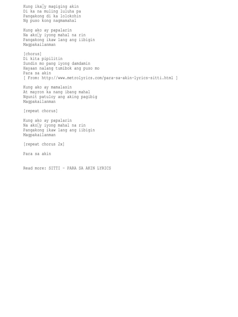 The song follows the story of Sam and Isa five years after their break-up. 12292016 PARA SA AKIN INTERLUDE Lyrics. Kung ikay magiging akin brdi ka na muling luluha pa brpangakong di ka lolokohin brng puso kong nagmamahal brkung ako ay papalarin brna akoy iyong mahal na rin brpangakong ikaw lang ang iibigin brmagpakaylanman brCHORUS.