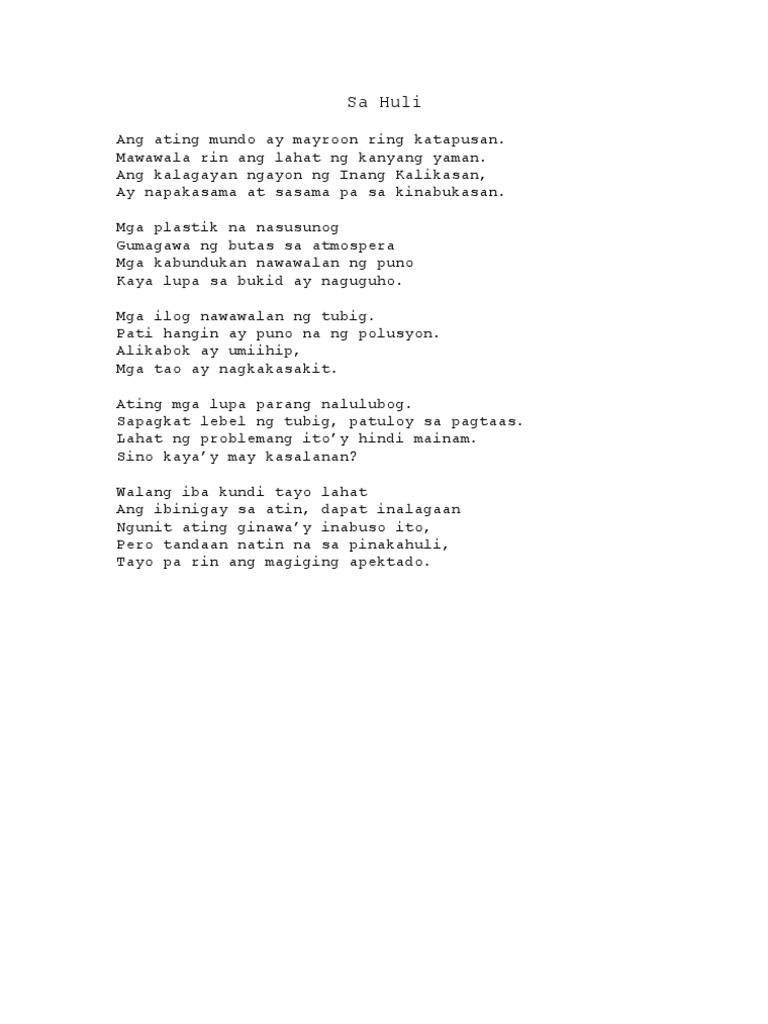 Hindi dapat matakot sa kamatayan dahil tayo namang lahat ay mamamatay at ano ang ikatatakot sa karalitaan ay nagsimula tayo sa kahirapan sa walang damit. Napaupo sa may sahig lupay napakalambot At tuluyan nakong inantok ugh Pakiramdaman kung sinong mauuna Ang lapit lang ng langit tila maaabot ko na Kumurot ng lupa pagkatapos sa apoy pabagain Sa tubig padaanin bumuo ng ulap palutangin sa hangin Mahirap na mahirap na Pagmamahalang walang halong kemikal Kelan ba tayo magiging ligal. Kahit hindi na maibabalik ang malinis na hangin sa dati nitong kalagayan dapat tumulong pa rin tayo.